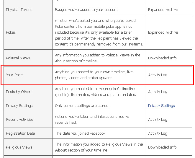 So what this means is that Your Posts, the things you've actually written on Facebook, are no longer included in the "Downloaded Info" which allegedly includes all of your info (and did from at least 2010-2013). The posts are not in the "Expanded Archive", either (I checked to be sure... it has dozens of files including Ad Clicks, Apps, Facial Recognition Data, Poke Data, Relationship Info, etc. ... but no wall posts). The "Activity Log" in which they are now categorized is online-only at Facebook, can't be downloaded, doesn't show all your posts at once, and can't be searched unless you know the date of the post that you're looking for in advance. (I considered trying the Wayback Machine to find a date when this was altered on the help page, but of course Facebook bricks off any internet crawlers by way of its robots.txt file.)